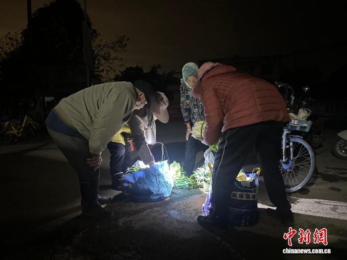 图为村平易近正在挨动手电筒将没有佳的菜叶剥离。旧沿佑 摄